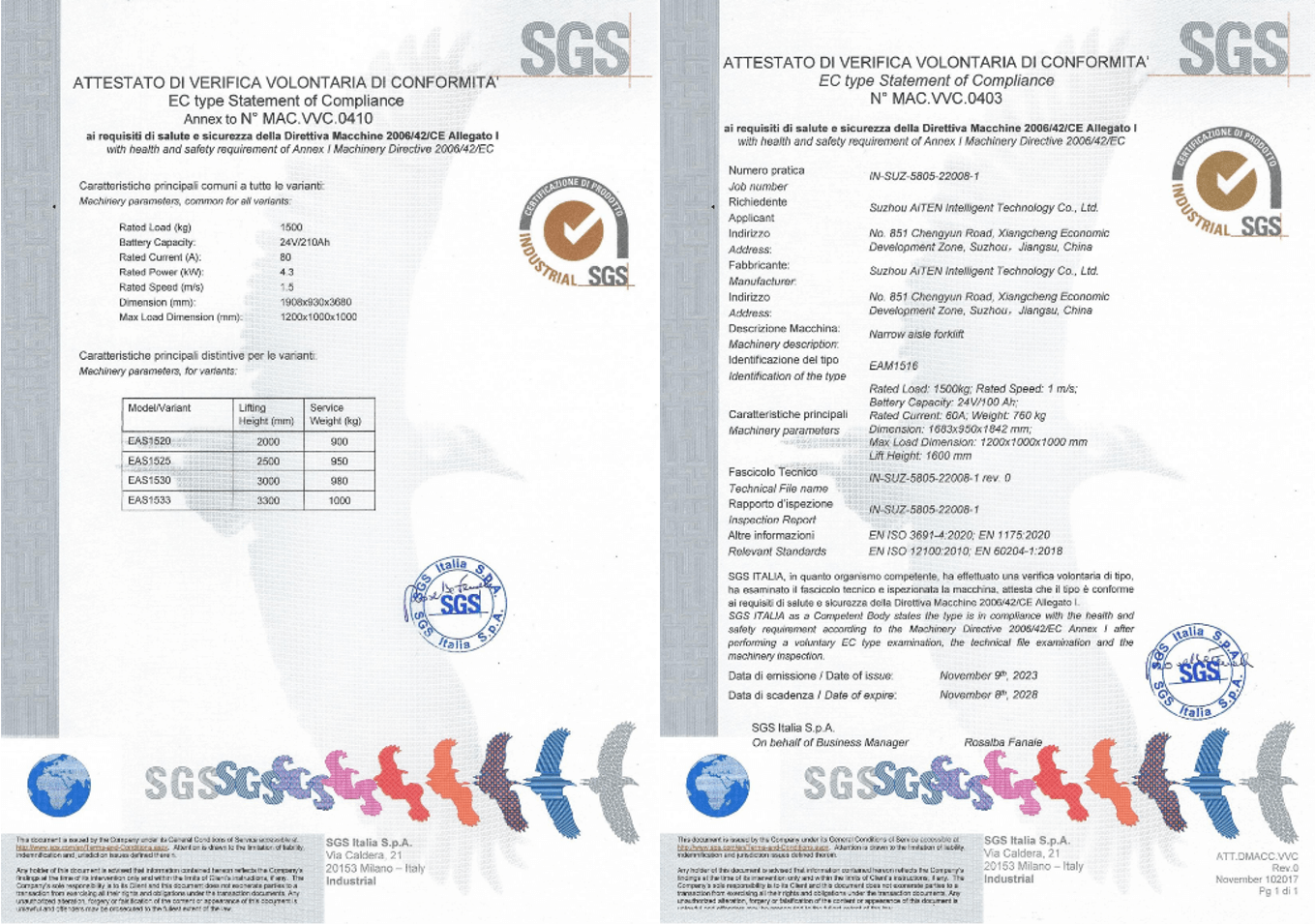 3. CE 标志(欧盟): 确保符合机械指令,强调对繁忙仓库等动态环境的风险评估,在这些环境中,叉车与行人和手动设备相互作用。为满足欧洲市场的法规要求,公海jcjc5500产品经过严格审核,为包括 MP10、AM1516、AE15、AS15 和其他产品在内的 AGV 产品获得了欧盟 CE 证书。
